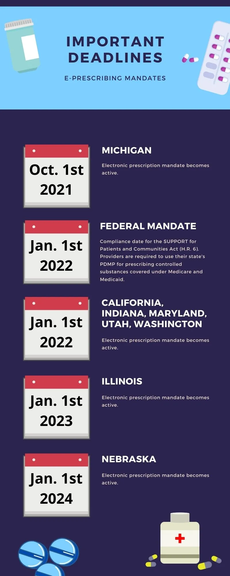 The deadline for federal e-prescribing mandates is just around the corner. Starting January 1st, 2022, providers are required to use their state’s prescription drug monitoring program (PDMP) for prescribing controlled substances covered under Medicare and Medicaid. This according to the SUPPORT for Patients and Communities Act (H.R. 6) passed in 2018.