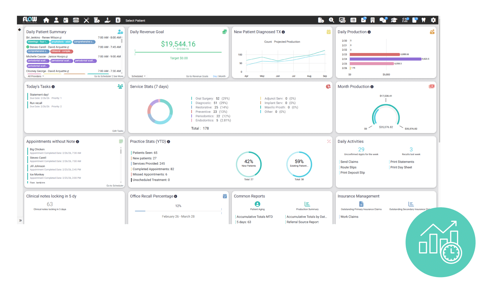 - Real-time visibility into production, collections, and insurance claims
